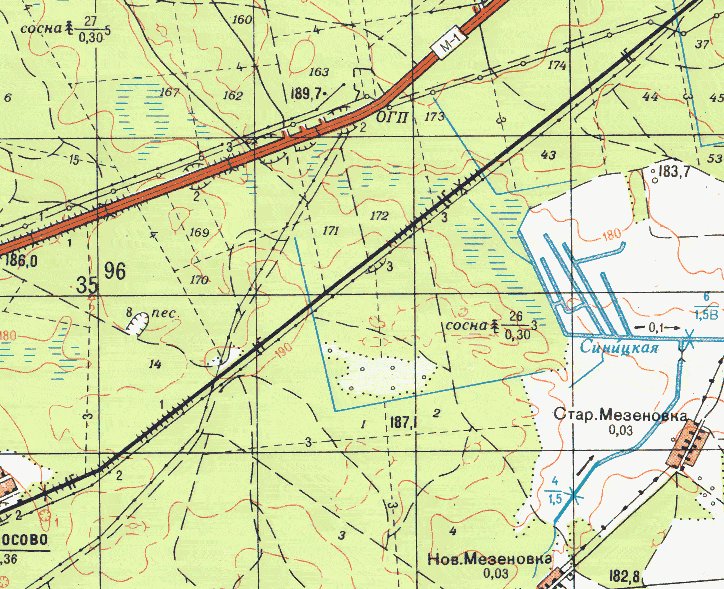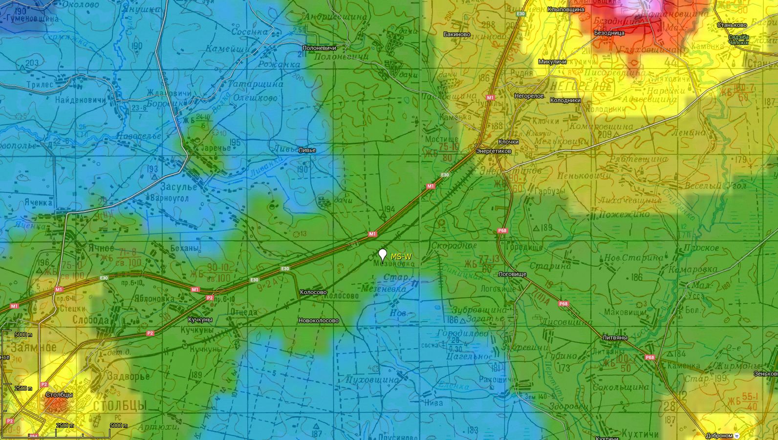 Ещё одним вариантом является маршрут по дороге между MS-W и MS-E, которая выходит в Большое поле Мезиновки, а далее -- в поле за лесом, рядом с деревней Новая Мезиновка. Однако, до этой площадки нужно идти около 3 км. Большое поле Мезиновки ночью сырое, покрыто сетью мелиоративных каналов.