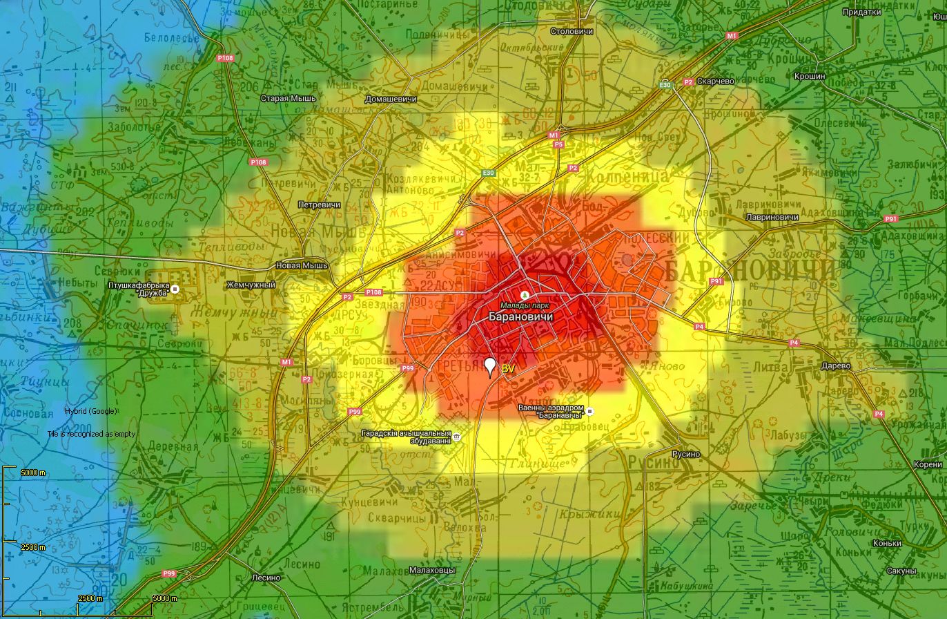 Дополнение от 17.09.2017. Как и предполагалось, прежняя точка будет если не застроена, то окружена домами и придётся двигаться дальше на юго-запад к отчистным сооружениям. Действительно, теперь нужно продолжить движение по улице Загородной, которая после пересечения с ул. 50 лет БССР называется ул. Марфицкого и Журавлевича. Она упрётся в жилые кварталы, но двигаясь дальше по прямой выходим к перекрёстку ул. Домейко и 50 лет ВЛКСМ. Ниже приведена панорама 180° новой площадки BV, центр панорама смотрит на юго-запад-запад (слева "замок" -- храм святой блаженной Валентины минской).