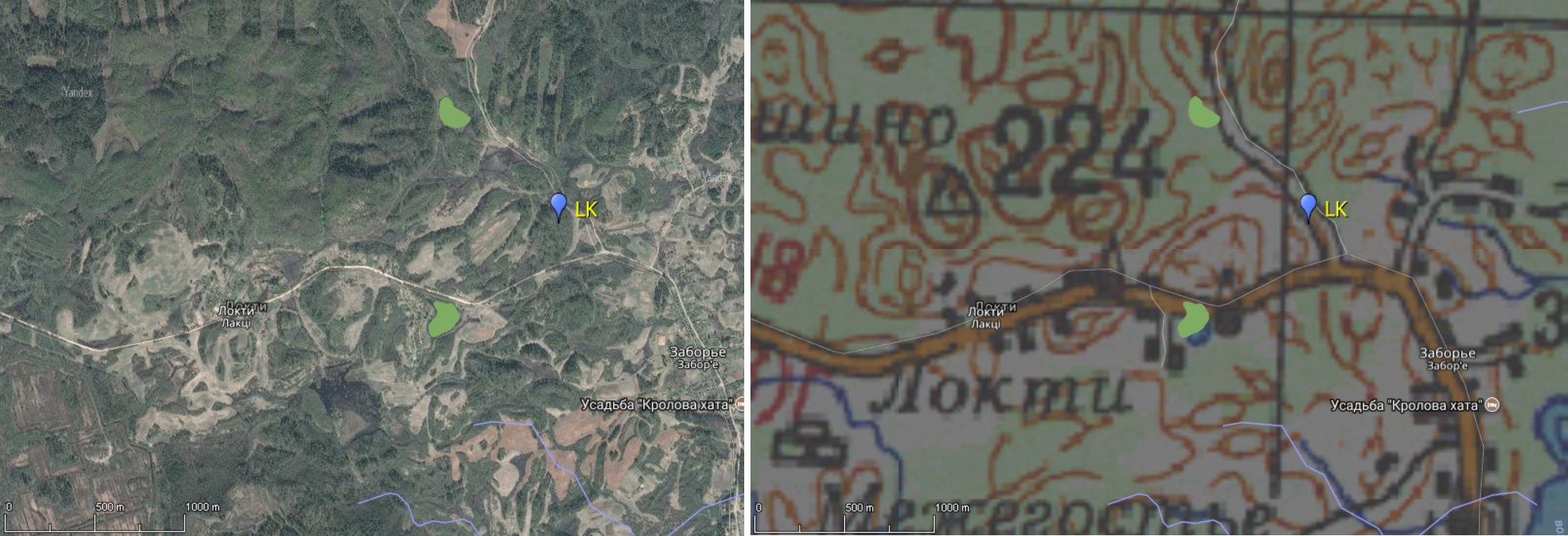 Наблюдательная площадка LK была разведана в ходе выезда на наблюдения 23 сентября 2017 г. Дорога до Россон в хорошем состоянии, от Россон до д. Локти -- в удовлетворительном. Площадка представляет собой цепь холмов, окружённых с юга на восток деревнями Гришино - Локти - Мамоли. Самый высокий холм находится севернее д. Локти (высота 224 м), но заехать на нём на машине не получилось из-за разбитой дороги. Восточнее д. Локти на повороте к д. Мамоли расположен более удобный для заезда холм, на котором и проводились наблюдения.