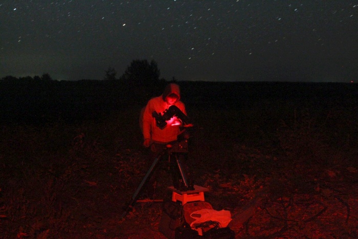 Засветка: Уровень засветки без влияния Млечного Пути 21,79m/"2 (показания SQM-L, 24.09.2017) в точке 55o 55' 32.8"N, 29o 18' 13.2"E при зенитном угле 50°. С учётом коррекции на атмосферную толщу -- от 21,88m/"2 при экстинкции k=0.7 до 22,04m/"2 при k=0.4. |