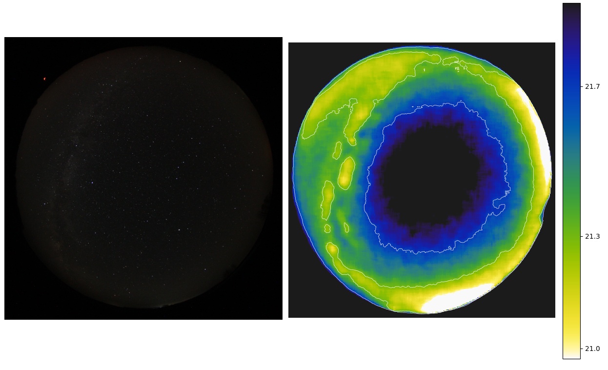 Засветка: Уровень засветки в зените 21,98m/"2(показания SQM-L, 07.04.2021) в точке 53o 35' 22.9"N, 29o 24' 55.8"E. |