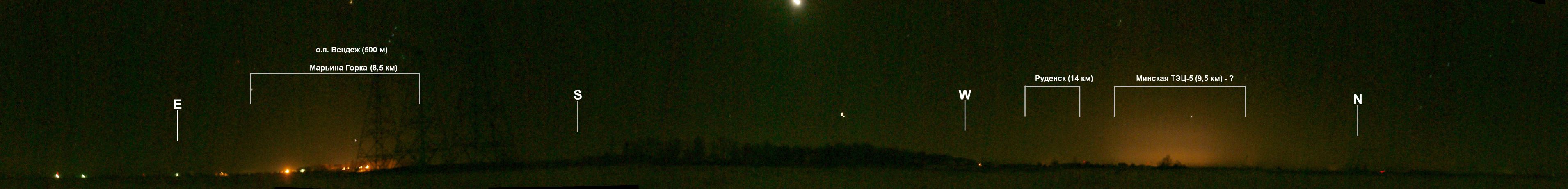Как видно, на 2012 г. основной источник засветки находится на северо-западе (предположительно, это огни Минской ТЭЦ-5, которая находится в 9,5 км). Руденск, Дружный и Свислочь также проецируются на этот азимут. Засветка от Минска -- вопрос проверки. Засветка от Марьиной Горки и фонарей на о.п. Вендеж (местная засветка) слабее, чем от ТЭЦ-5. Южный участок неба довольно тёмный. Для оценки высоты конусов засветки можно опираться на следующие данные: на юго-западе самый яркий объект в небе (у верхнего края панорамы) -- Луна на высоте 33° над горизонтом, ниже и немного правее в небе видна Венера -- на высоте 12°.