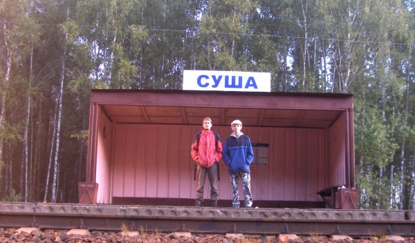 Приехав на о.п. Суша мы по традиции сделали кадр на фоне "будки" станции. ![]() Рис. 4. Участники 8-й Одиссеи: Антон Глинистый (knox, слева) и Виталий Мечинский (Lupus, справа). Точка "SU-ST" на Рис. 3.