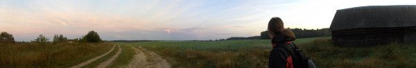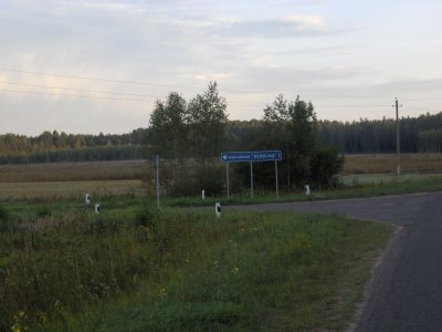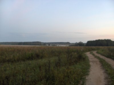 Поле не сильно удобное для наблюдений, т.к. на севере расположена речка (в низине) и деревня. Ширина поля 400 м, длина 1 км. Пошли через деревню по шоссе, в направлении д. Усакино на севере -- нашей конечной точки путешествия. Деревня уже начала просыпаться, и первые грибники стали выбираться на улицу в направлении ближайших лесов. От шоссе направо в сторону речки Сушанки шла дорога, там было поле, но опять же слишком близкое к реке. Рис. 6. Вид на дорогу в направлении реки Сушанка. Точка Р2 на Рис. 3.