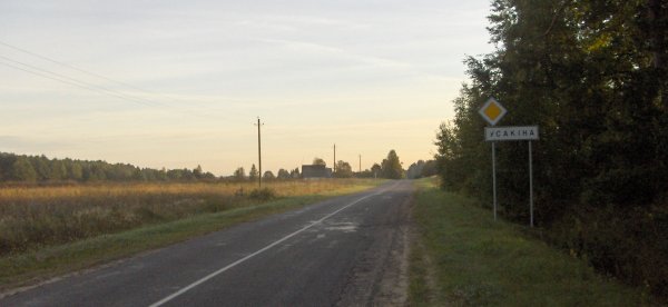 На этом "программа-оптимум" нашей экспресс-одиссеи была выполнена и мы перешли к "программе-максимум" -- пройти деревню Усакино и выйти к её северной границе, где планировали сделать привал. ![]() Рис. 9. Указатель на начало деревни Усакино. Точка Р5 на Рис. 3.