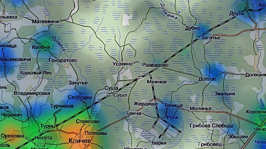Размышляя над очередной Одиссеей (cо списком остальных Одиссей можно ознакомиться на странице нашего сайта, посвящённой загородным наблюдательным площадкам), я стал просматривать давно составленный список из наиболее тёмных мест, достижимых поездом. Список этот я составил на основе новой карты засветки Беларуси (по данным 2010 г.). К счастью, выбирать пока есть из чего -- из порядка двух десятков станций и остановочных пунктов хотелось выбрать что-то особенное. Давно я присматривался к участку между Осиповичами и Могилёвом -- на нём находится одно из самых тёмных мест в Беларуси. Но, как водится, нет в мире совершенства, и главным фактором, по которому я не решился ехать туда весной был тот, что места эти окружены болотами и было не понятно, проходима ли местность в условиях весеннего паводка. Теперь же настало время посетить эти места. Смотря на карту засветки Беларуси, а точнее на участок Осиповичи-Могилёв, в глаза бросается участок северо-восточнее Кличева -- редкие синеватые пятна сменяются серой зоной, на которой кое-где появляются светлые "прозрачные" участки. Эти последние участки и есть наиболее тёмные места Беларуси. ![]() Рис. 1. Карта участка 8-й Одиссеи.