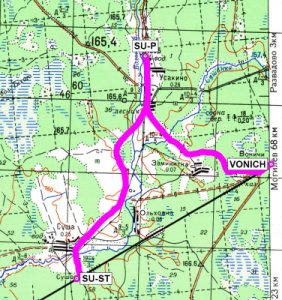 Выбор пал на о.п. Суша. Из всех остальных на этом участке он привлекал наличию полей недалеко от станции, и наличию возвышенностей, т.к. вся окрестность была сплошь леса да болота. Так уж получилось, что нам нужно было вернуться в субботу в Минск до двух часов дня, и, чтобы посетить эти места, мы выехали без одной минуты полночь 31 августа 2012 г. (летом), продолжая ехать уже в наступившей осени. До осиповичей ехали плацкартом (т.к. в осиповичах дизель на Сушу отправлялся в 3ч54м ночи, нам пришлось бы ждать более 4 часов, если бы поехали на последней электричке, а так ждали почти два часа). Доехали быстро (1,5 часа), подождали два часа в Осиповичах, сели на дизель и через 1ч20 минут вышли на о.п. Суша. Было примерно 5ч30м утра, утренняя заря уже освещала восток. У нас было менее 5 часов в запасе, так что предстояла эксперсс-одиссея. Трек нашего передвижения приведён ниже. Рис. 3. Трек передвижения участников 8-й Одиссеи. Слева -- на топографической местности, справа -- на спутниковых снимках.