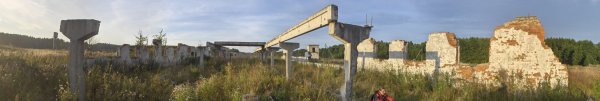 Проходя деревню, мы видели несколько собак, лениво свернувшихся калачиком. При нашем приближении они лениво поднимали голову, по-доброму и с интересом смотрели на чужаков в их владениях и, казалось, были не прочь подружиться. В Усакино на многих хатах висели спутниковые тарелки, домики хоть и были старыми, но ухоженными -- сразу видно, что усакинцы хоть и живут рядом с болотом, но покрываться тиной не собираются. Время поджимало, и желудок тоже давал знать, что бессоная начь и для него прошла без отдыха и он требовал порцию пищи. Выходя из Усакино на северной её границе мы увидели какие-то развалины, которые лежали в направлении нашего движения по левую сторону от дороги. Туда и направились. Развалины эти представляли, судя по общей разметке фундамента постройки, недостроенный или разрушенный коровник -- вытянутой в направлении север-юг барак, бетонные раскрошившиеся от времени плиты... В голове почему-то мелькнуло воспоминание детства о рассказе Гайдара "На графских развалинах" -- так и закрепилось у меня название за этим местом. Рис. 10. На "графских развалинах", вид на юг. Точка "SU-P" на Рис. 3.