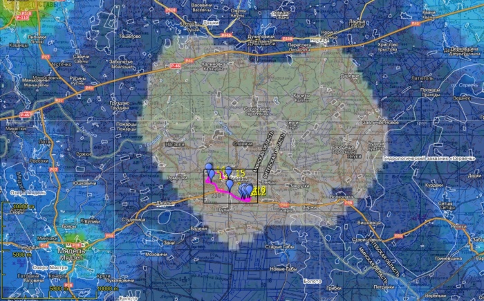 Выбор места объяснялся тем, что в этом региона находится тёмное пятно засветки в форме "сердечка" -- см. карту ниже. В его юго-западной части мы и провели разведку.