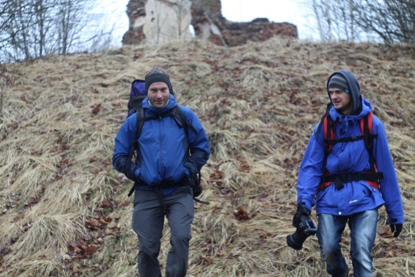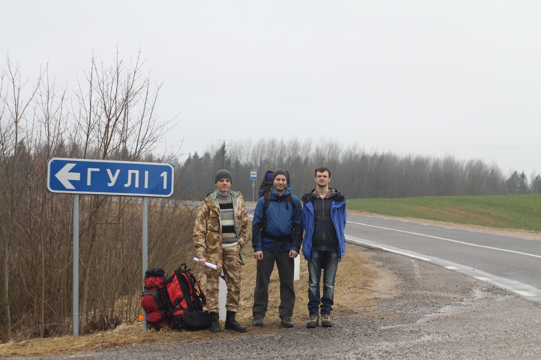 И вот свершилось -- 1 апреля 2017 г. собрались Вова (Pova), Максим (biz_0n) и Виталик (Lupus). Выезд с Центрального автовокзала Минска до Мяделя, там быстрая пеерсадка до д. Гули -- на юго-восточной оконечности Свенцян. Дорога заняла чуть более 4 часов. На повороте к д. Гули мы вышли и сделали ритуальную фотографию (точка 1 ).