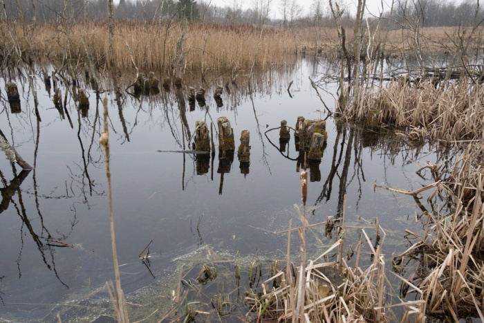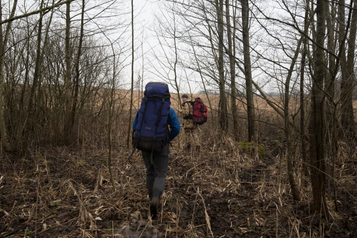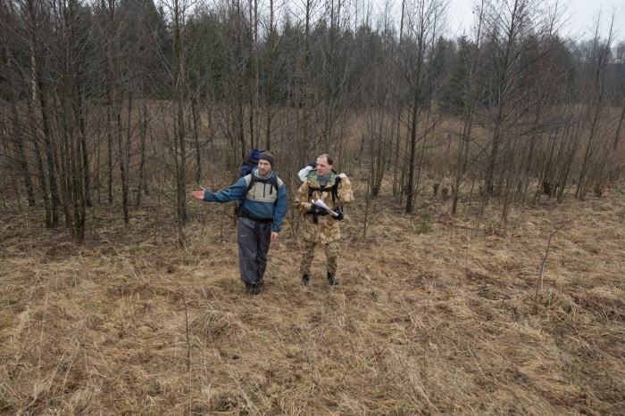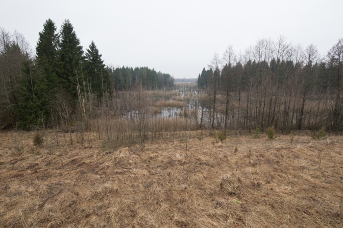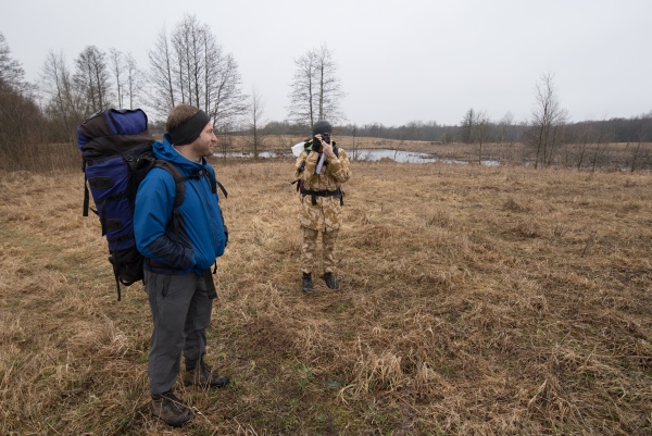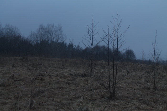 На север за холмом с часовней находился заболоченный участок, который нам предстояло пройти. Тут я совершил главную ошибку -- на спутниковых снимках виднелась дорога, которая шла через заболоченность в виде узкой косы -- её я и рассматривал в качестве главного места переправы. Я специально выбирал Свенцяны как тёмное и высокое место -- стоял разгар весны, и вода ещё не сошла. Но вот с этим проходом и вышла заминка, о чём будет написано ниже. Пока же мы вышли в поле на север от часовни (точка 5).