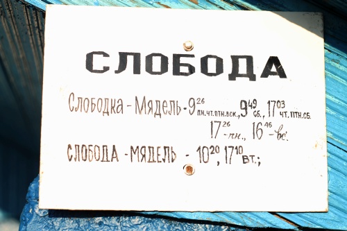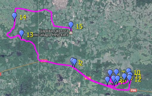 Пока совсем не стемнело, собрали дрова, поставили палатку и стали готовить колбаски на углях -- долгожданная награда после выматывающего перехода. Постепенно появлялись просветы, тонкий серпик Луны шёл к закату. К полуночи совсем распогодилось, и у меня было вдоволь времени, чтобы провести замеры засветки. По усреднённым показаниям SQM-L-метра засветка в этом месте была 21,78m/"2! На тот момент это был одиссейский рекорд, и я сиял как майская роза, создавая дополнительную локальную засветку. Утром мы направились по длинному Г-образному пути в сторону остановки возле поаворота на д. Гули. Деревня Ковали была полу-заброшенной, а вот Слобода -- большая, со школой и магазином. Там же мы увидели остановку, откуда автобус шёл через нашу остановку у Гулей и далее в Мядель. Тут и решили садиться (точка 15).