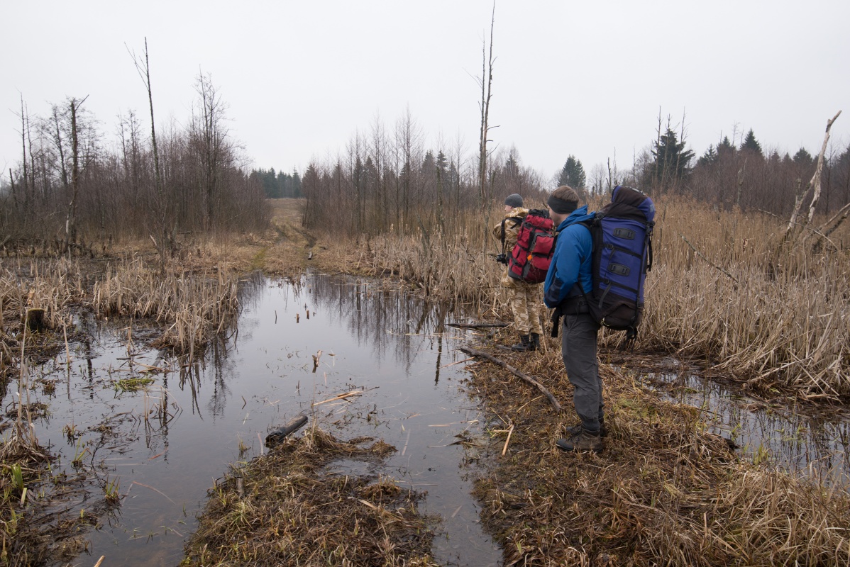 Чем дальше, тем было сложнее пробираться через топкие места, болото всё явственее двавло о себе знать. Вова и Макс надо мной подтрунивали -- я же вёл их в Свентянские горы, а мы пока вязли в болоте, которое они в мою честь окрестили Волчьим (точка 9).