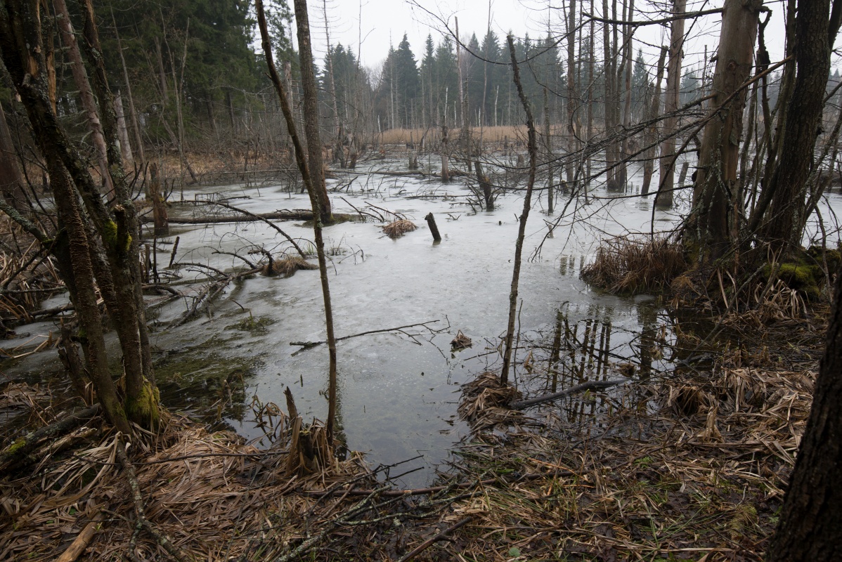 Тут мой мозг отказался соображать, и мы вернулись к часовне и направились дальше на восток в попытках найти проход. Посмотрев бы заранее увидели, что заболоченность переходит на востоке в болото и тянется на 3 км. Нужно было вернуться к Гулям и от ниж идити на север, но махать после драки смысла нет... Пейзажи лично для меня были прекрасные -- раняя весны, заболоченность сменяется хомами и наоборот (точка 8).