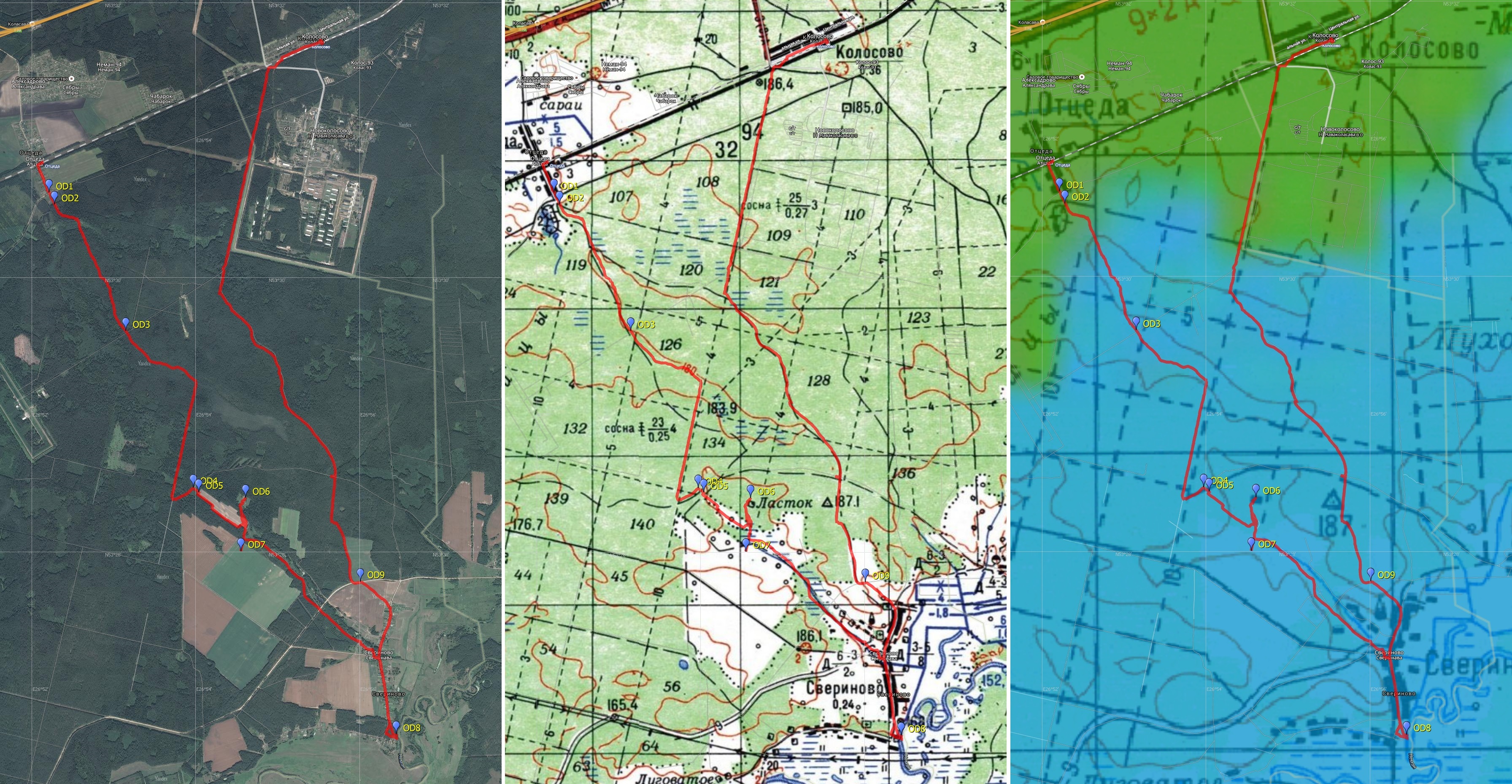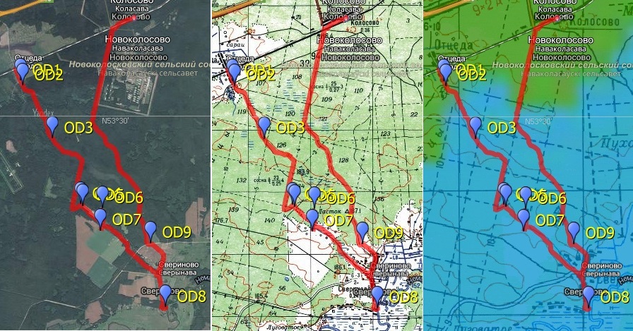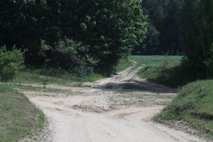 Дополнительным стимулом выбраться именно сюда было то, что большая часть вылазки проходила по лесу, что несколько облегчало переход под летним солнцем. Да и заглянуть на хутор Ласток, где жил в 1885-1890 гг. Якуб Колас, тоже хотелось. Доехав до ст. Отцеда и перейдя ж/д пути, я направился на юго-восток через одноимённую деревню. В её конце находится перекрёсток -- нам прямо, в лес (точка OD1 на карте выше).