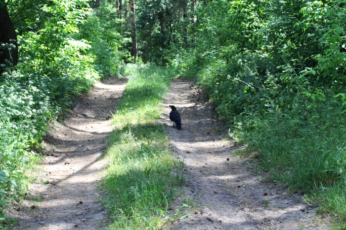 Прямо на входе в лес по дороге важно расхаживал ворон -- видимо, хозяин этого леса. Я посторался его не беспокоить и двинулся дальше (точка OD2).