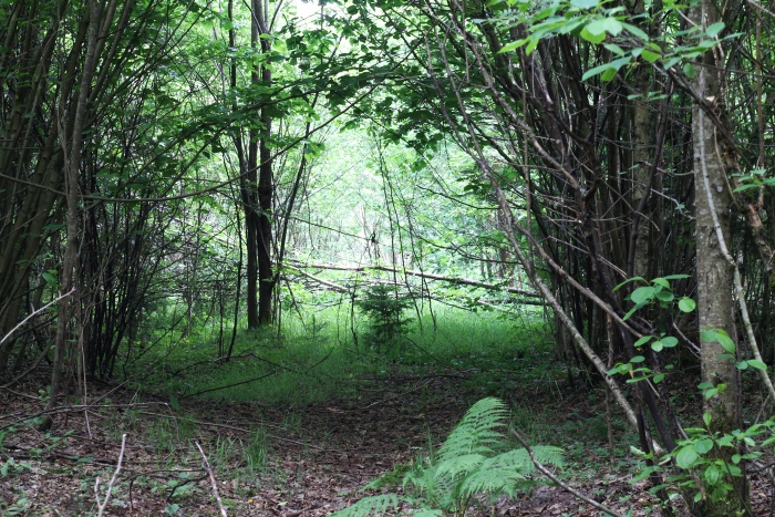 Ещё чеерз километр я дошёл до перекрёстка лесных дорог -- направо шла дорога, которая должна была почти вывести к желанным полям. И эти 1,5 км я шёл мимо зарослей орешника. Просто удивительно, что его тут так много -- я раньше не встречал такого. Через указанные 1,5 км слева я увидел ещё одну лесную дорогу -- явно заброшенную, но по картам она должна была меня вывести к длинному полю, с которого можно было попасть на хутор Ласток, окружённый лесом. С трудом удалось найти выход в это поле (точка OD4).