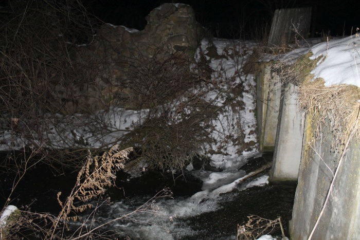 Целевая точка нашей вылазки (высота 210,8 м) находилась в 4 км к юго-западу от станции, а пока мы решили разведать широкое поле с возвышенностями по другую сторону от железной дороги -- от станции туда вела грунтовая дорога. Пройдя по ней и свернув в поле, вышли в центр поля. Ниже приведена 360o-панорама этого поля (точка OZ2 на карте выше, центр панорамы на восток). Сплошная облачность позволила явственнее выявить купола засветки, которых было не так уж и мало. После этого мы вернулись к станции и пошли в д. Озерница, через которую лежал путь к нужной нам высоте. Через Озерницу протекает речка Ивановка -- это самое низкое место нашего путешествия, порядка 150-160 м над уровнем моря. По дороге в деревню и в ней самой горели фонари, что было необычно для наших белорусских деревень -- был уже первый час ночи, а тут такая иллюминация. В деревне перешли мост и начали плавное восхождение (точка OZ3 на карте выше). ![]() Мост через р. Ивановка в д. Озерница.