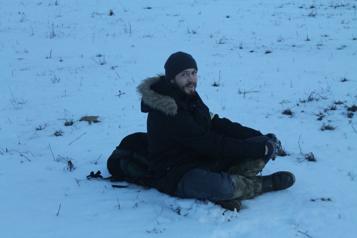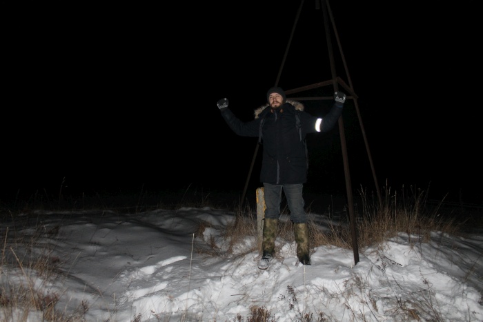 От речки нам предстояло набрать метров 40-50 высоты, что заметно ощущалось -- деревня оставалась на севере от нас, а мы всё выше и выше подымались над ней, и перед нами открывалась панорама окрестностей: вся Озерница светилась фонарями. Благо впереди поле выходило на ровный уровень, и мы могли спрятаться за кривизну рельефа от этих фонарей. У самой кромки леса мы нашли геодезический знак -- точка 210,8 м была покорена! ![]() Антон (Knox) позирует на фоне геознака "210,8 м".