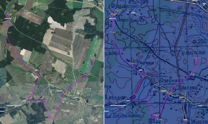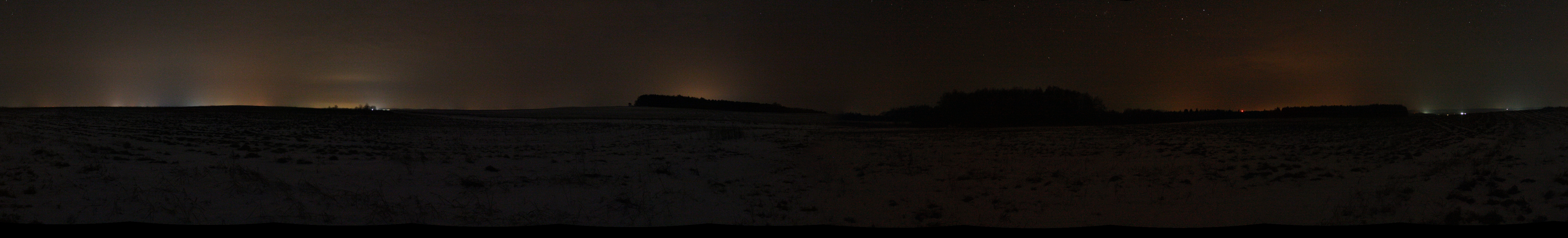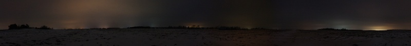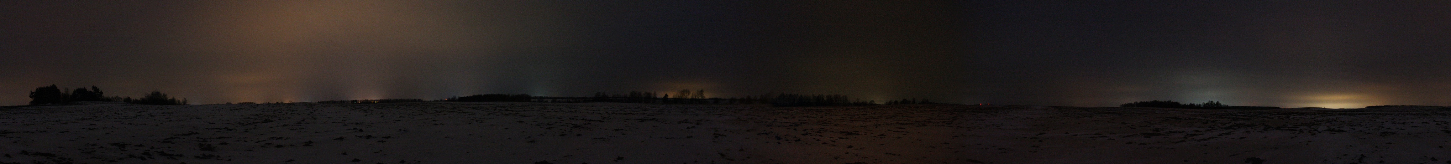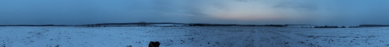На этой "вершине мира" мы решили сделать привал и перекусить. За беседами о прошедших 10 годах одиссей не сразу заметили, что погода начала улучшаться -- взглянув на небо, я радостно подскочил и стал доставать из кейса измеритель засветки: на небе появились прорехи, и стала доступна возможность измерить засветку в зените. Прозрачность, конечно, была не самой хорошей, да и снег дополнительно подсвечивал небо, но измерения показали уровень засветки 21,55 m/"2 -- не так и плохо, учитывая условия. Ниже приведена 360o-панорама (центр кадра на юг) поля вокруг высота 210,8 м (точка OZ5 на карте выше). Наступили вторая половина ночи, ветер усилился, но мы были полны энтузиазма -- программа юбилейной Одиссеи была выполнена на 100%, удалось даже измерить засветку, на что я слабо расчитывал перед поездкой. Позади было порядка 8 км пути, и мы решили двигаться к холмистым полям на северо-западе от Озерницы, чтобы разведать центральную часть тёмно-синей зоны засветки, которая идёт "перешейком" между Слонимом и Зельвой. Варианта было два -- либо мы из д. Клепачи мимо д. Волчки, что западнее Озерницы, возвращаемся на исходную станцию и ждём утреннего поезда, либо идём на соседний о.п. Плетяничи, откуда возвращаемся в Минск. К Клепачам начали сбрасывать высоту до 150 м, снова пересекли р. Ивановку, а затем медленно начали снова набирать высоту по дороге к Волчкам. Потиху светало, перед нами открывались холмы западнее Клепачей. Туда вели грунтовки и при желании можно заехать на машине. Перед д. Волчки сделали привал, и решили, что двигаемся к о.п. Плетяничи, реализуя программу-максимум. Дорога даже зимой была вполне проезжаема. ![]()