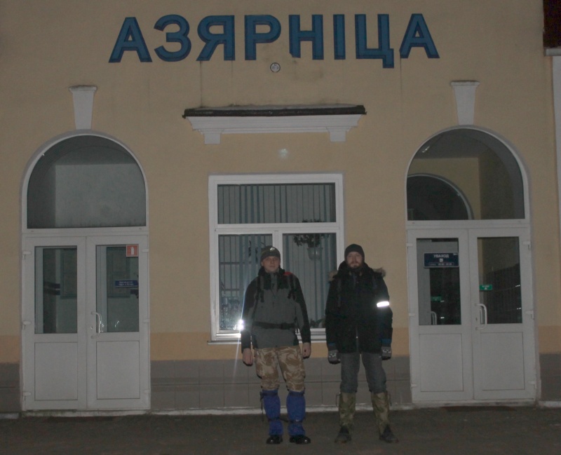 В ходе этой, 25-й по счёту, Одиссеи было пройдено 19,5 км. Площадка получила обозначение OZ согласно классификации минской группы наблюдателей "Infinty", удалённость от Минска -- 194 км. Со списком остальных Одиссей можно ознакомиться на странице нашего сайта, посвящённой загородным наблюдательным площадкам. Ниже небольшой отчёт. К концу суток 26 января добрались до точки старта -- ст. Озерница, что на полпути из Слонима в Зельву (в направлении Волковыска), точка OZ1 на карте выше. ![]() Lupus (слева) и Knox перед зданием ст. Озерница.