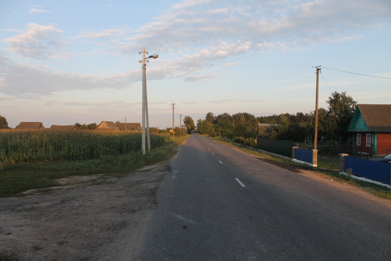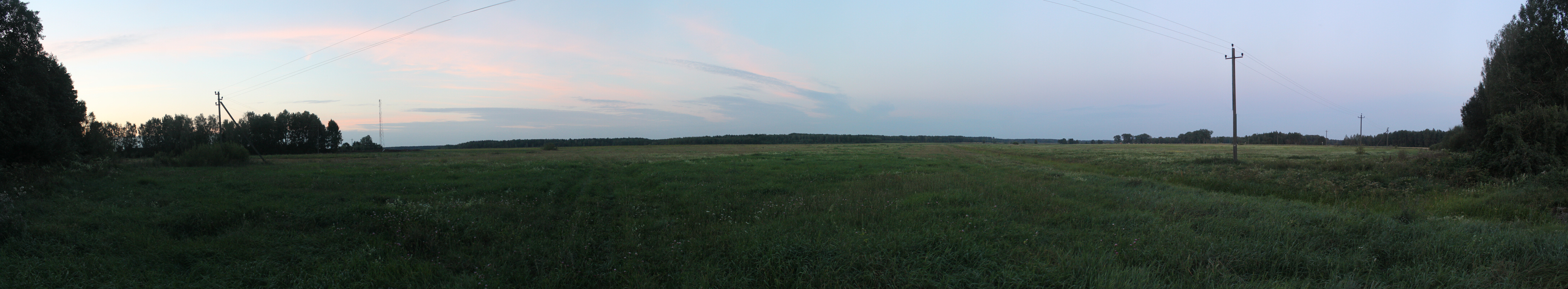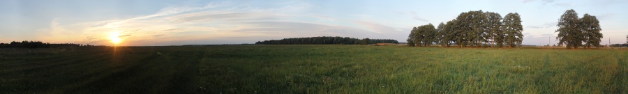 Эта деревня оставила в памяти самое неизгладимое воспоминание: идём мы себе спокойно до дороге к началу деревни, и вдруг в сумеречной мгле замечаем свечение в лесу. Присмотрелись -- а это кладбище, на котором местные затейники установили светодиодные фонарики. Такие садовые, с аккумулятором и солнечной батареей. Светят они слабо, но их изобилие на кладбище создавало непередаваемый колорит. Случайному впечатлительному путнику в ночи было бы стремновато... За деревней сняли панораму, уже 6-го по счёту, поля -- по обе стороны от дороги. Панорама 180o поля после д. Козевичи, центр кадра на юго-юго-запад. Точка LN14.