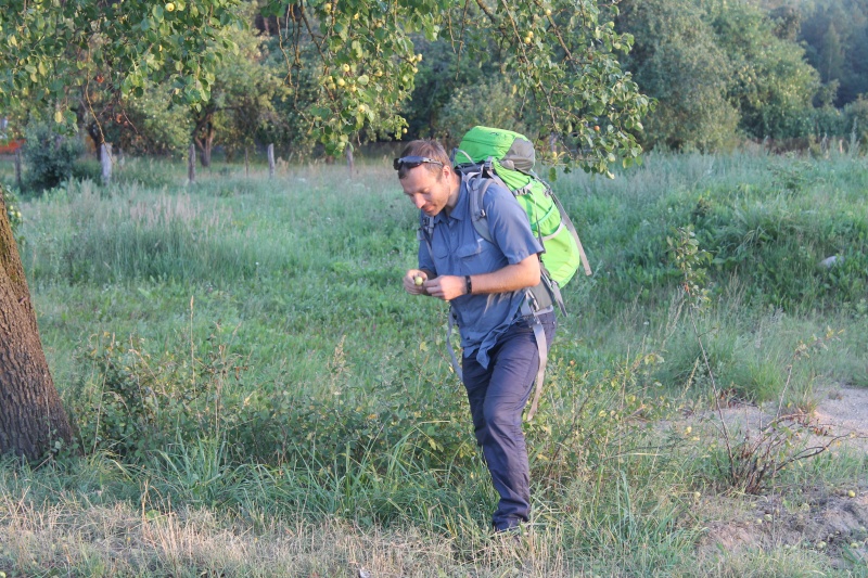 По дороге Вова не мог устоять, чтобы попробовать дикие яблоки и прочие фрукты с деревьев у заброшенных хат -- впереди была целая ночь активного перехода, нужно пополнить запас углеводов. ![]() Вова объедает грушу.