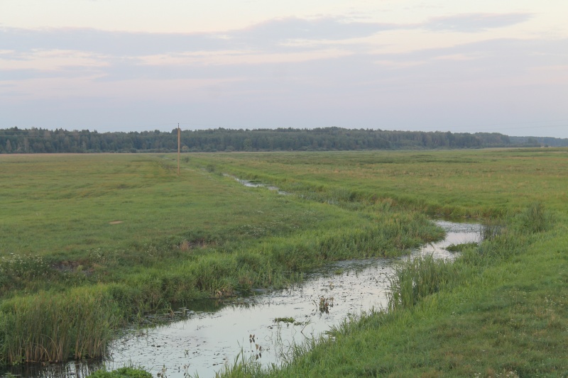 Зайдя на мост, я смотрел на восток -- где-то там, в 4 км, находится д. Шильвы, там за мной гонялся овод, там я не смог пройти лабиринт каналов в поисках Чапуньки... Зато сейчас вот она -- тихая и спокойная. ![]() Река Чапунька. Точка LN5, вид на восток.