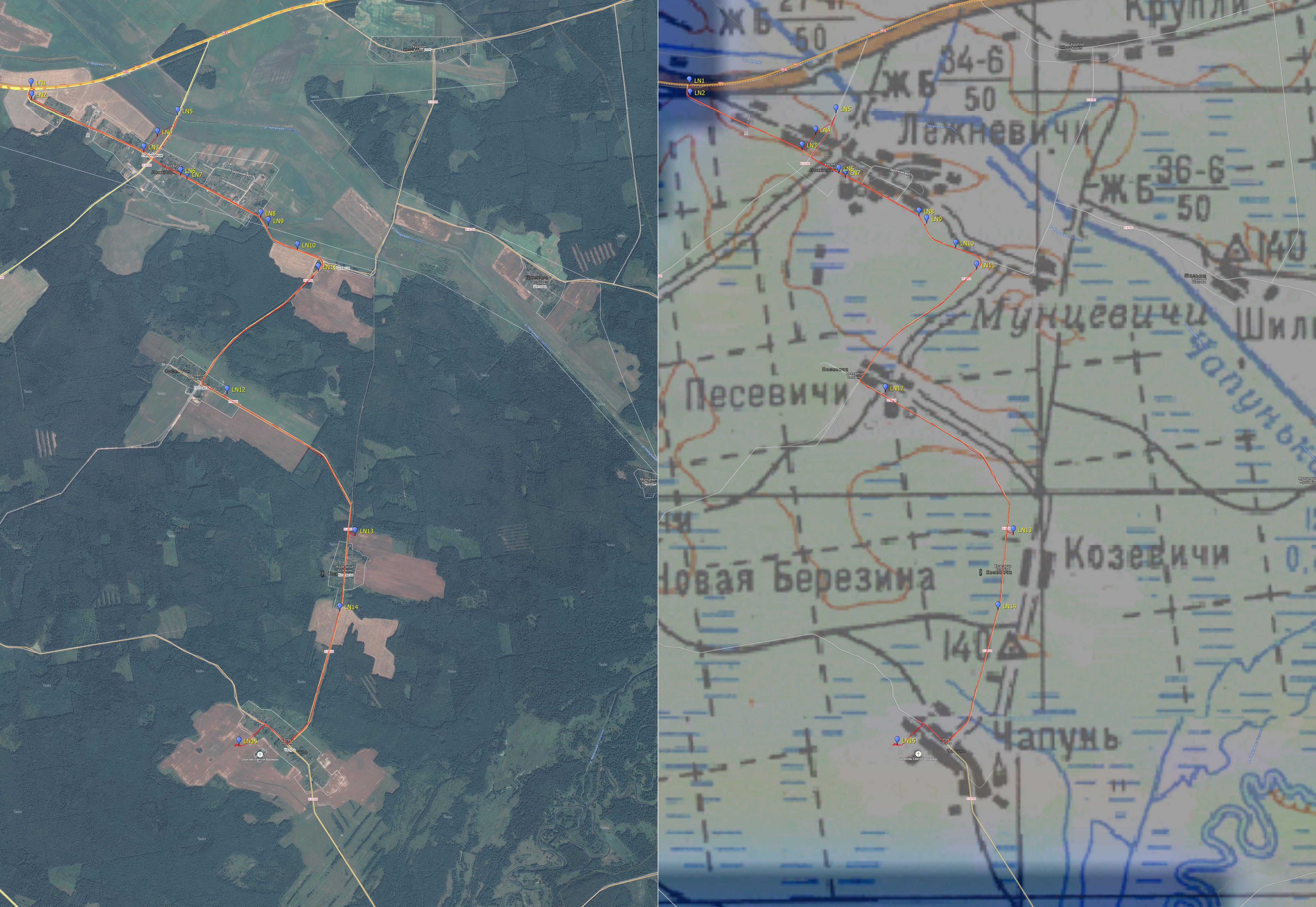 Естетсвенно, я заранее знал, что рядом с Лежневичами протекает р. Чапунька -- та самая, до которой я так и не смог добраться в прошлую вылазку в Налибоки. Проходя по деревне вдали я увидел мост через неё. ![]() Мост через р. Чапунька. Точка LN3.