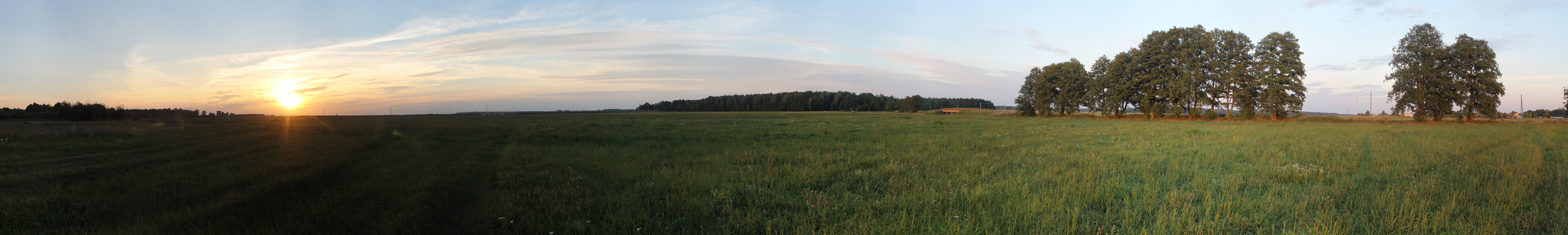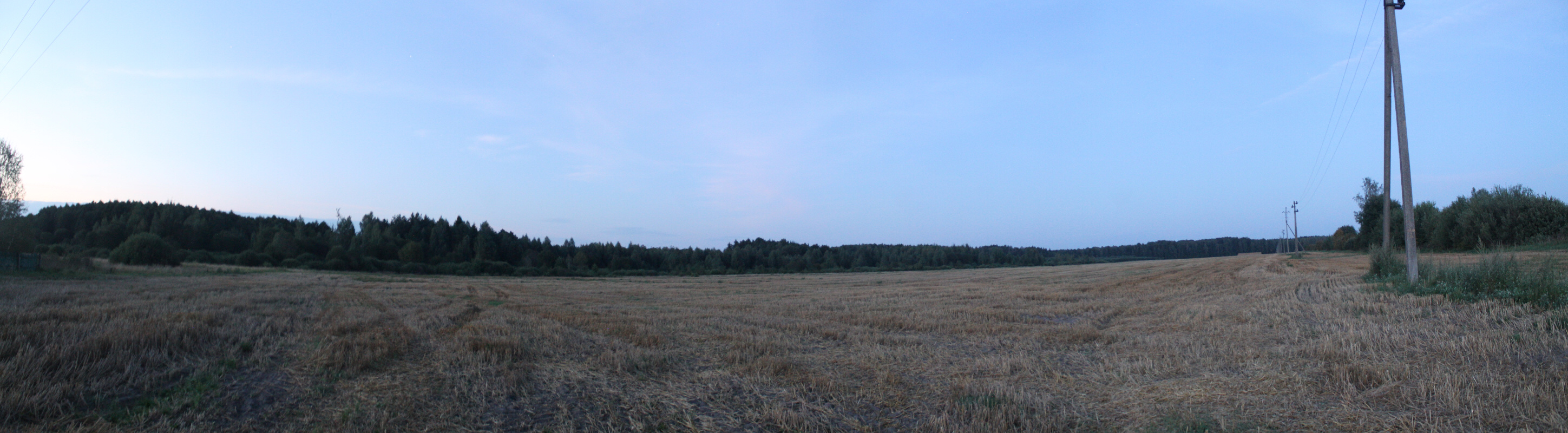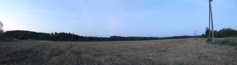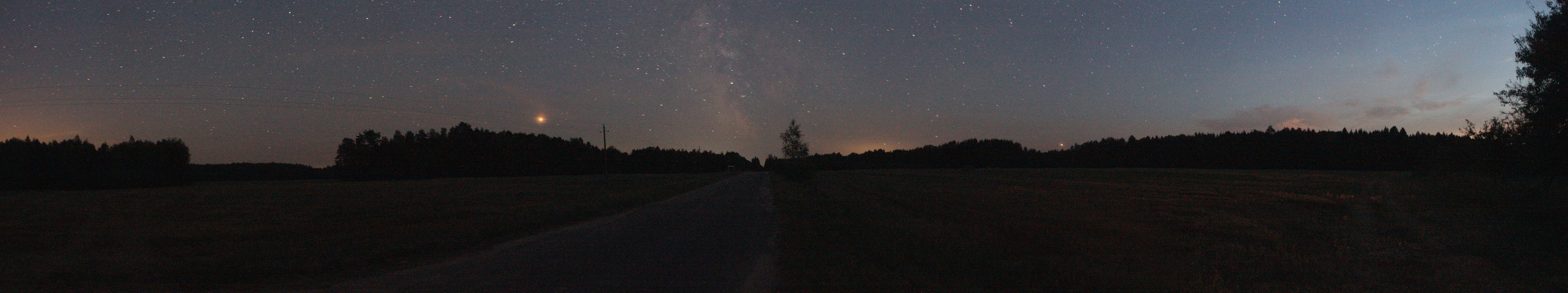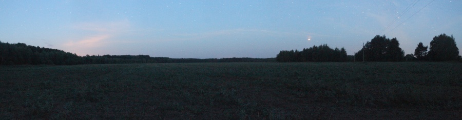 Солнце постепенное садилось, и мы начинали привыкать к походу в сумерках. До следующего поля перед д. Козевичи было 2 км ходу. Поле большое -- почти 900х500 м, на момент съёмки было вспахано. Уже вовсю светили звёзды, потому для панорамы пришлось ставить экспозицию и ISO повыше. Панорама 120o поля перед д. Козевичи, центр кадра на восток. Точка LN13.