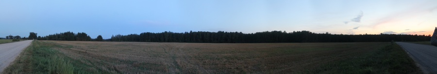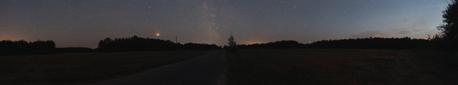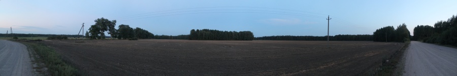 Последние 1,5 км пути прошли спокойно -- основная задача была найти в потёмках в д. Чапунь поворот в широкое поле на запад от него. Ну, как-то отыскали. Погода начинала портиться, на небе сновали циррусы, и прозрачность резко падала. Мы вышли в поле, расположились на одной из десятков спресованных тюков соломы и приступили к измерениям. К сожалению, Налибоки не сдались и в этот раз: SQM-L показал засветку 21,50 m/"m, что сильно не дотягивало до серой зоны засветки. Обратная маршрутка была только в 7-м часу утра, до остановки было почти 12 км и вся ночь. Кстати, на юге этого поля начинаются канали и течёт река Западная Березина, в которую и впадает Чапунька. Но далековато -- в 2,5 км. Панорама 360o поля LN на запад от д. Чапунь, центр кадра на запад. Точка LN15.