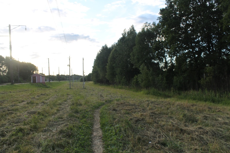 Чтобы выйти в поле проходим в направлении движения электрички из Минска по правой стороне ж/д путей по тропинке, которая возле трансформаторной будки сворачивает вправо в лесополосу. ![]() Тропинка от о.п. Хмелевка в поле. Точка HM1.