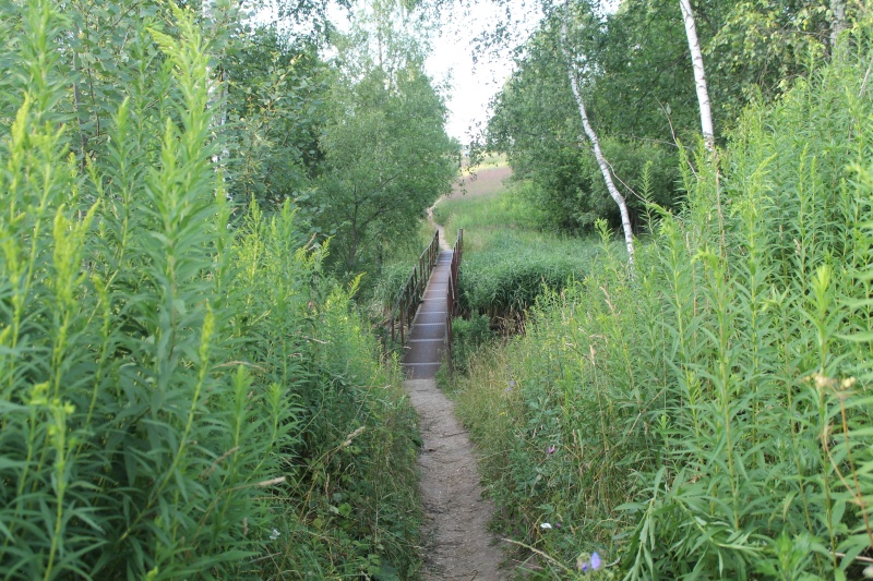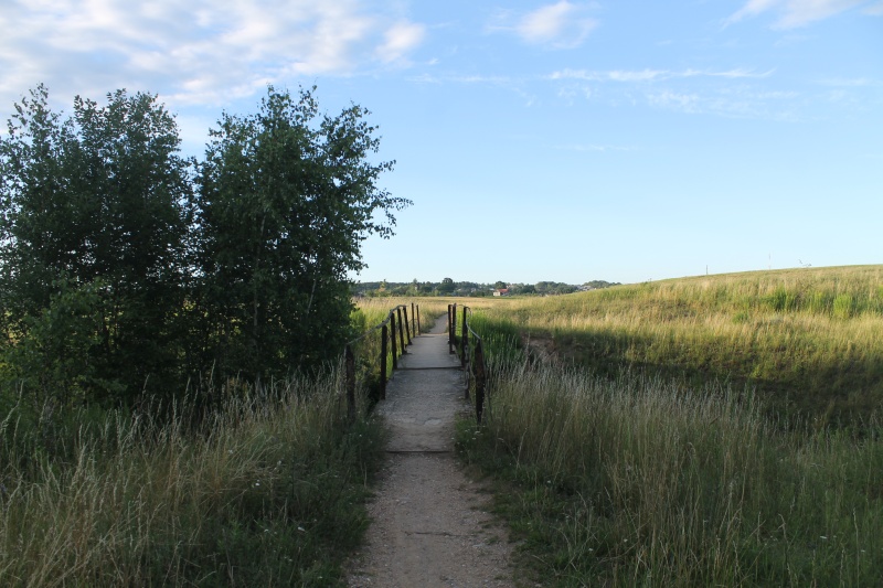 После выхода из лесополосы переходим по ещё одному посту через овраг, за которым с правой стороны виден холм -- нам туда. ![]() Мост через овраг.