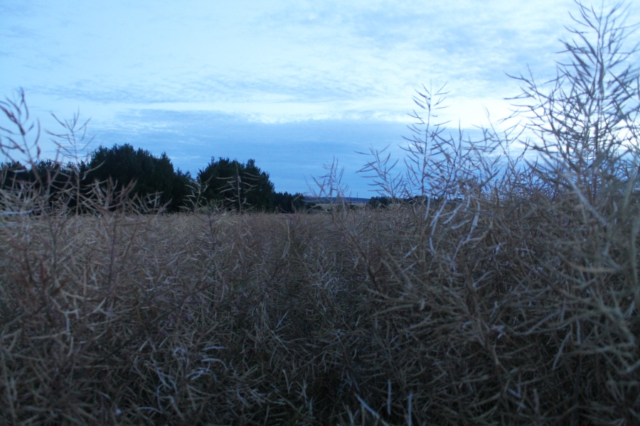 Поле южнее д. Горошки лежит в низине, оно с каналами и не представляет интереса для наблюдений. Поворачиваем на запад, обходим д. Горошки по южной оконечности, проходим садовое товарищество и через лесополосу выходим к полю. За ним -- д. Светлый Путь, куда я хотел попасть. Но дальнейший путь был вовсе не светлый, и дело не только в том, что солнце село. Поле было засеяно полевым горошком (пелюшкой). Стебли уже высохли, переплелись между собой и проходимость этих "джунглей" не очень высокая. ![]() Вид на поле, заросшее пелюшкой. Точка HM10.