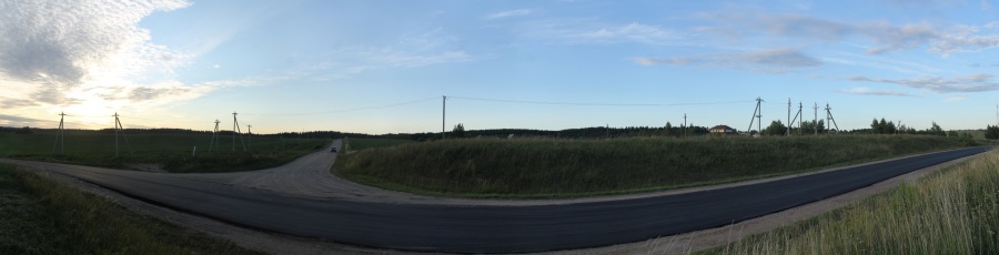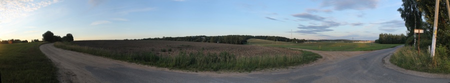 Мы же сворачиваем на просёлочную дорогу влево и начианем петлять по улочкам садовых товариществ с тем, чтобы выйти на северную оконечность д. Лошаны. Выходим к перекрёстку: вправо уходит дорога в деревню, прямо на холм -- в "оторванную" часть деревни, а нам нужно налево. Панорама 180o поля на северо-восток от д. Лошаны, центр кадра на северо-восток. Точка HM8.
