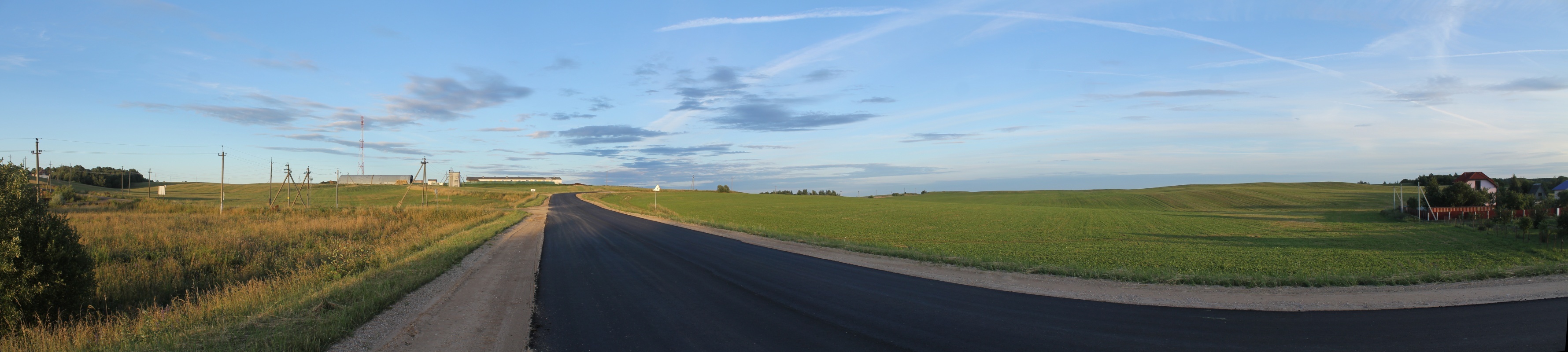Обходим д. Новашинос с северо-востока и выходим по шоссе Н8944 к полям -- с права от шоссе поле HM, а прямо за фермой раскинулось поле на пригорке, которое уходит на восток почти на километр. Панорама 180o поля на северо-восток от д. Новашино, центр кадра на восток. Точка HM7.