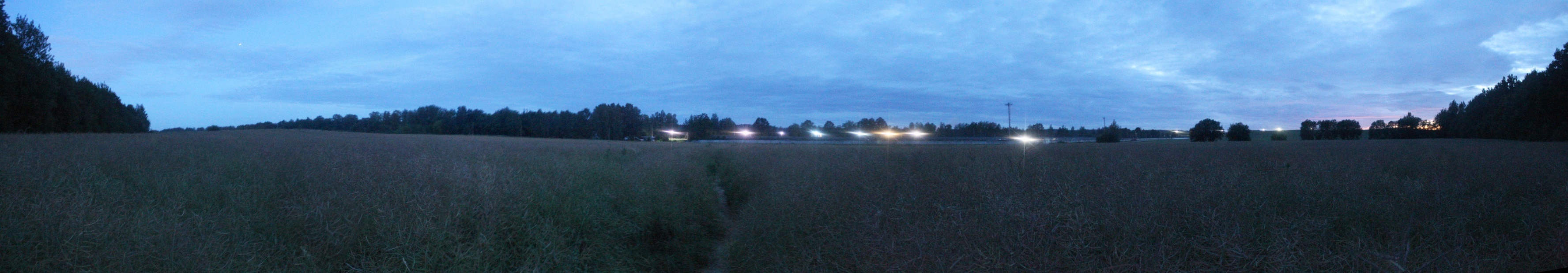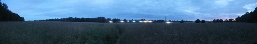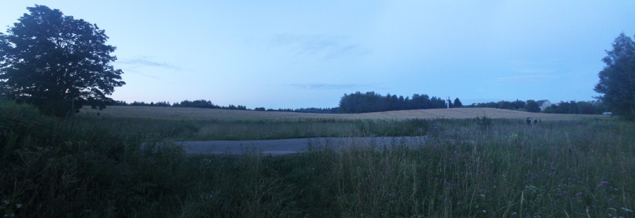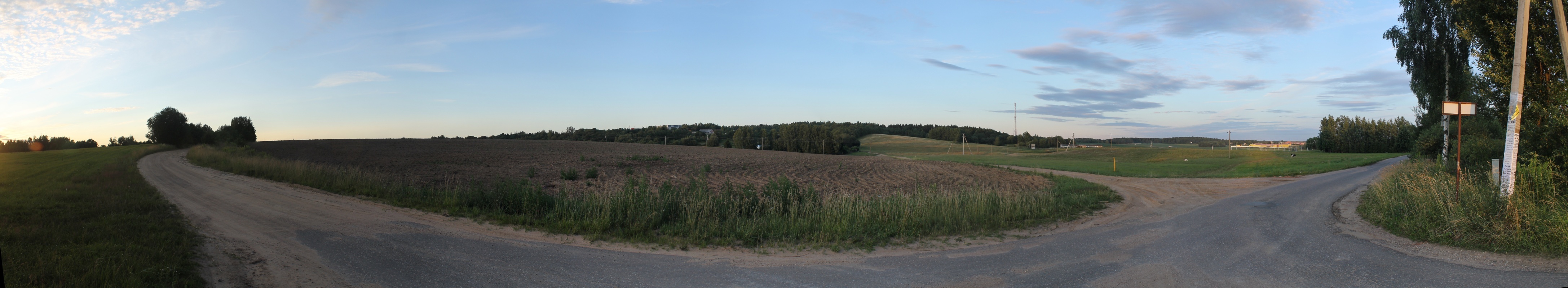 Но делать нечего -- нужно успеть на последнюю электричку, а идти ещё около 2,5 км. После 500-метрового перехода по этим зарослям карманы были полны горошка, но я таки вышел к деревне. Напоследок оглянулся и сфотографировал это злополучное поле. Панорама поля на юго-восток от д. Светлый Путь, центр кадра на северо-восток-восток. Точка HM11.