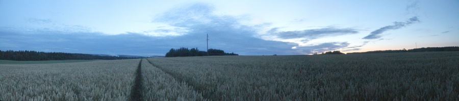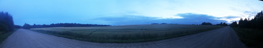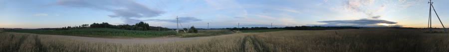 А впереди меня ждало холмистое поле, поросшее зерновыми. Сумерки сгущались, повышалась влажность, и объектив стал запотевать. Быстро снял панораму и направился наперерез через холм к ст. Анусино. Это поле получило обозначение AN. Панорама 180o поля AN, центр кадра на юго-запад. Точка HM12.