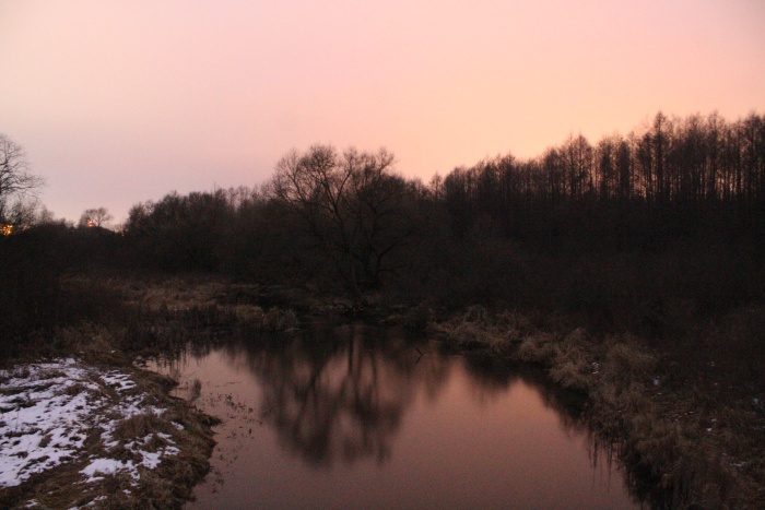 Выйдя на шоссе Н9531 я направился через лес к р. Перетуть. Вид с моста на неё показан ниже. За 30 с экспозиции при ISO6400 хорошо заметнен розоватых оттенок засвеченного неба. Снега на полях не было (как и всю последующую зиму -- первую без морозов ниже -10 С и постоянного снежного покрова), только в лесу он кое-где сохранялся. ![]() Мост через р. Перетуть (точка EN6).