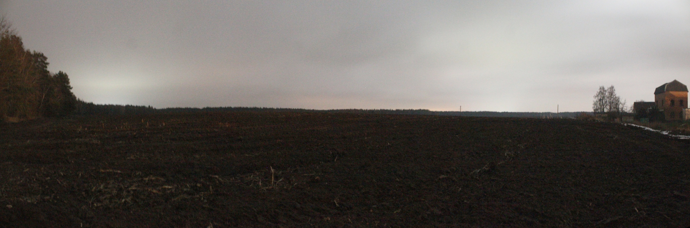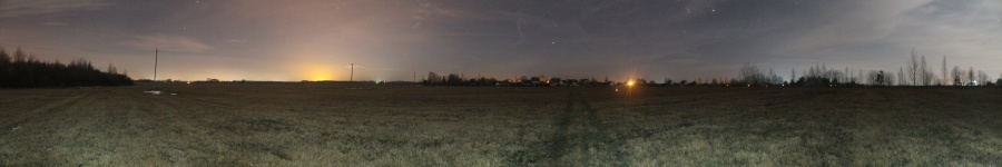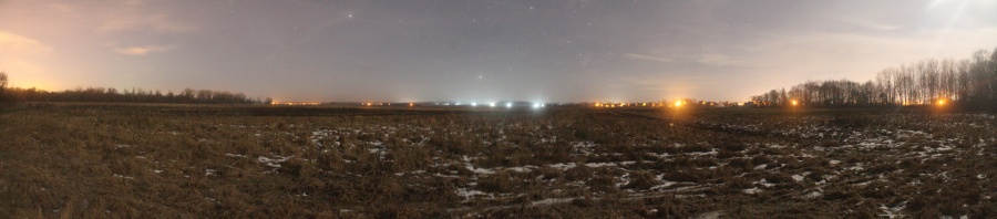 Свернув на восток я вышел к полю побольше. Тут условия были получше, но яркий прожектор частично освещал поле, что тоже не добавляло комфорта. В диаметрально противоположном углу поля виднелись огоньки дома, туда вела тропинка. По ней я и отправился. Панорама 90o поля на юго-востоке пос. Энергетиков, центр кадра на юго-восток. Точка EN5.