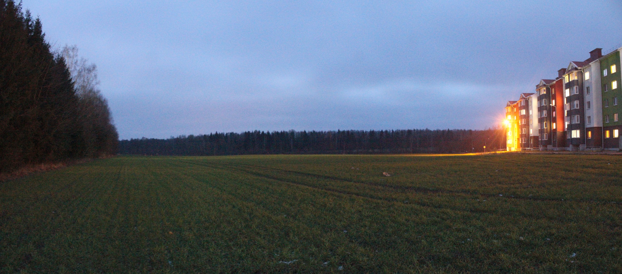 Тут расположено небольшое поле треугольной форму, но близость новостроек делает его уж совсем малопригодным для наблюдений. Панорама 90o поля на юго-западе пос. Энергетиков, центр кадра на юго-запад. Точка EN4.
