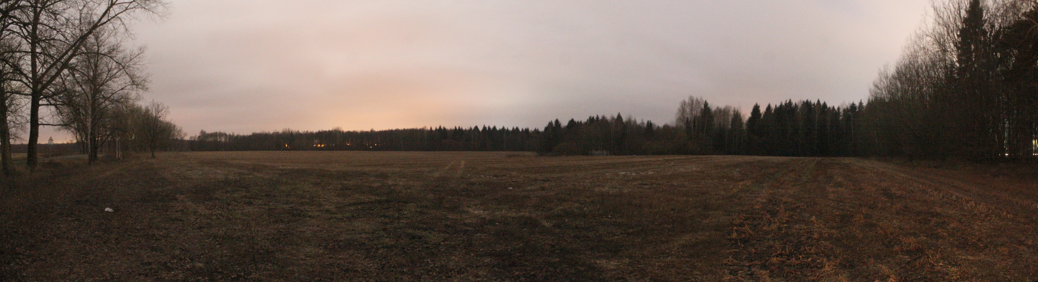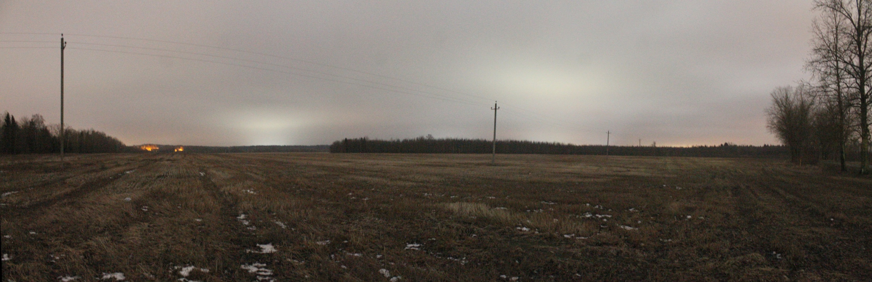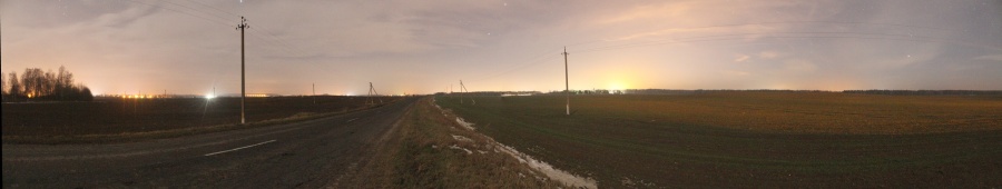 Через 1,5 км я вышел к северо-восточной оконечности д. Колодники: поле справа было с холмом, скрывавшим за собой лес, а слева повсюду были разбросаны огни фонарей. Панорама 180o поля на север от д. Колодники, центр кадра на север. Точка EN12.