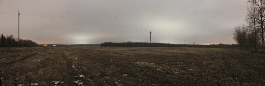 Прододжая двигаться по шоссе Н-9531 я дошёл до перекрёстка с просёлочной дорогой на север, куда и направился. Здесь, сойдя на лесную дорогу, решил сделать привал и подкрепиться. Через деревья стала проглядывать Луна -- погода начала улучшаться, в осплошной облачности появились прорехи. Выйдя к границе леса я оказался у большого поля, лежащего немного ниже уровня дороги. Слева фонари подсвечивали д. Комаровщина, а за ней -- Колодники. Дальнейший мой путь лежал туда. Панорама 180o поля на юг от д. Комаровщина, центр кадра на север. Точка EN11.