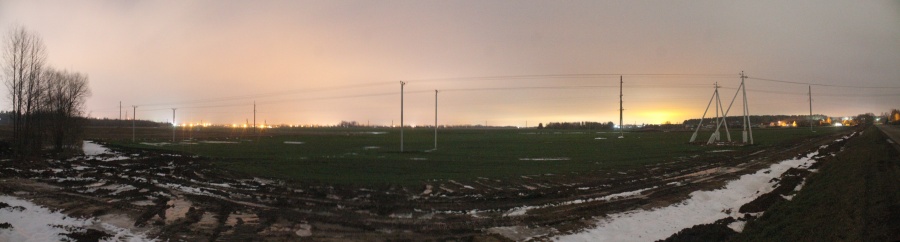 Ещё через метров 700 на восток я вышел из лесополосы, на север открывалась панорама на поле у деревни Мельковичи. На горизонте повсюду огни, поле с каналами, место не самое удобное для наблюдений. Панорама 180o поля на запад от д. Мельковичи, центр кадра на север. Точка EN9.