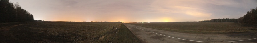 Через метров 700 я вышел к полям юго-западнее Негорельского комбината хлебопродуктов -- достаточно тёмные поля для наблюдений. Дорога Н-8377 разделяет их между собой. Панорама 90o поля юго-западнее Негорельского комбината хлебопродуктов, центр кадра на юго-запад. Точка EN7.