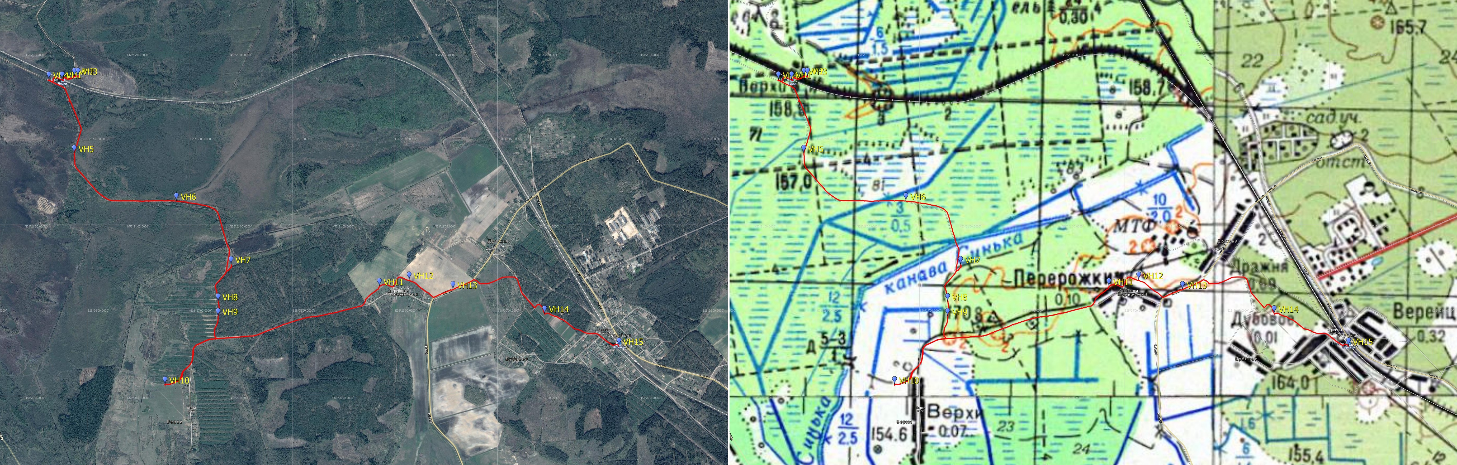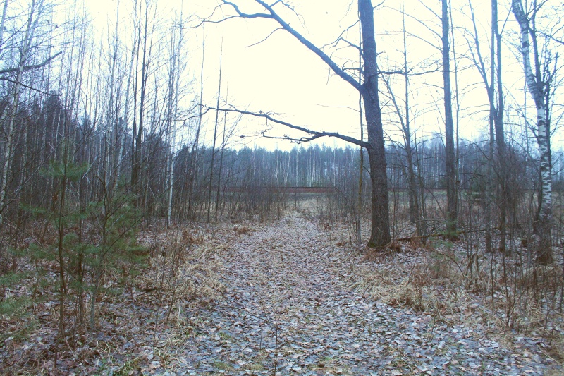 Вернувшись на перрон, я перешёл на другую сторону -- путь мой лежал к д. Верхи на юге. Но сначала нужно было найти выход с перрона на дорогу. Уже смеркалось, потому я сначала продёрся по-дикому, а уже потом нашёл нормальный проход, просто нужно было метров 120 вернуться в сторону Минска, от перрона идёт тропинка через лесополосу. ![]() Проход от о.п. Верхи до дороги, точка VH4.