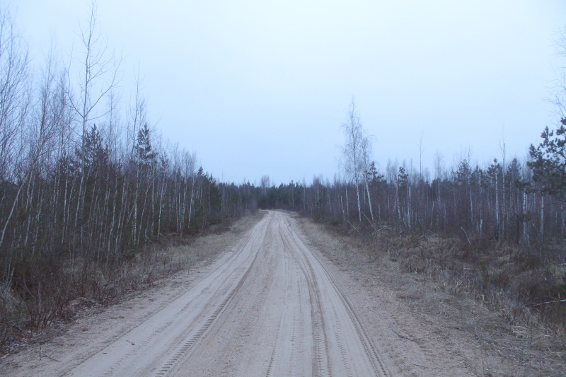 Выйдя на грунтовку, я начал однообразный переход среди болот. Фото ниже полностью иллюстрирует типичный пейзаж на протяжении следующих трёх километров. ![]() Дорога через болота от о.п. Верхи, точка VH5.