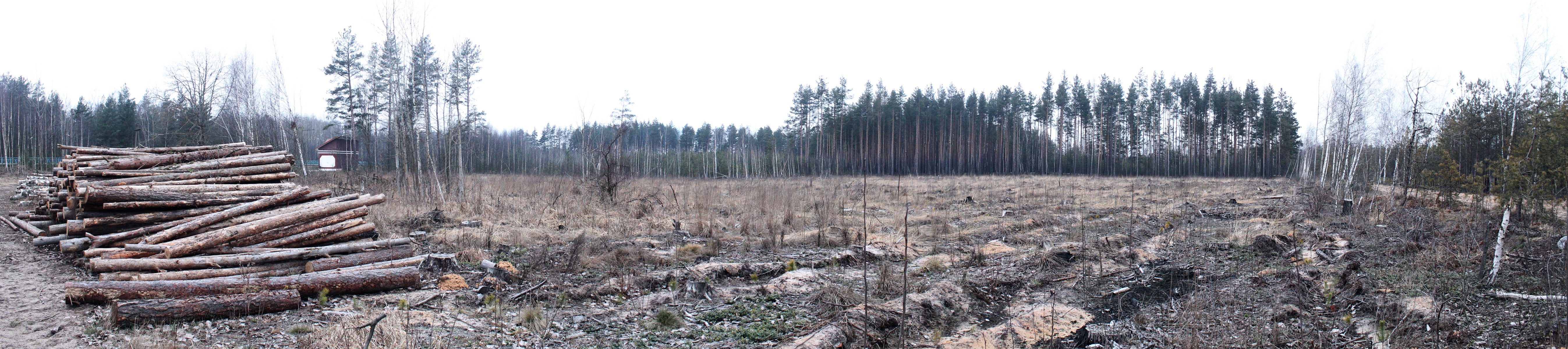 Панорама 90o поляны на месте вырубки, центр кадра на северо-восток. Точка VH9.
