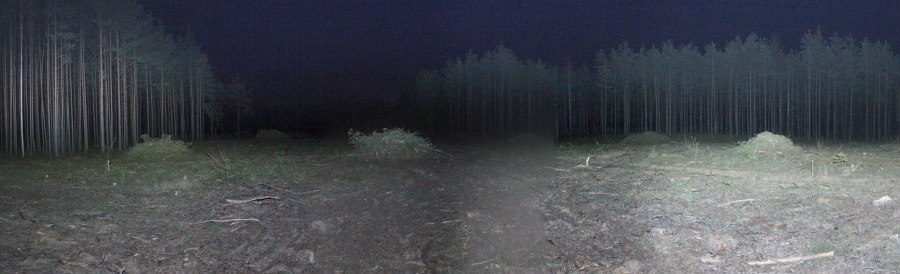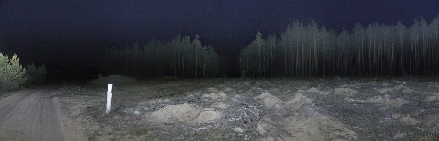 Я забыл пульт дистанционного спуска затвора, потому более длительные экспозиции делать не мог, приходилось подсвечивать фонариком. Через метров 500 я вышел к двум небольшим полянам (менее 100 м в поперечнике), тут была недавняя вырубка. Панорама 180o новой поляны на месте вырубки, центр кадра на восток. Точка VH8.