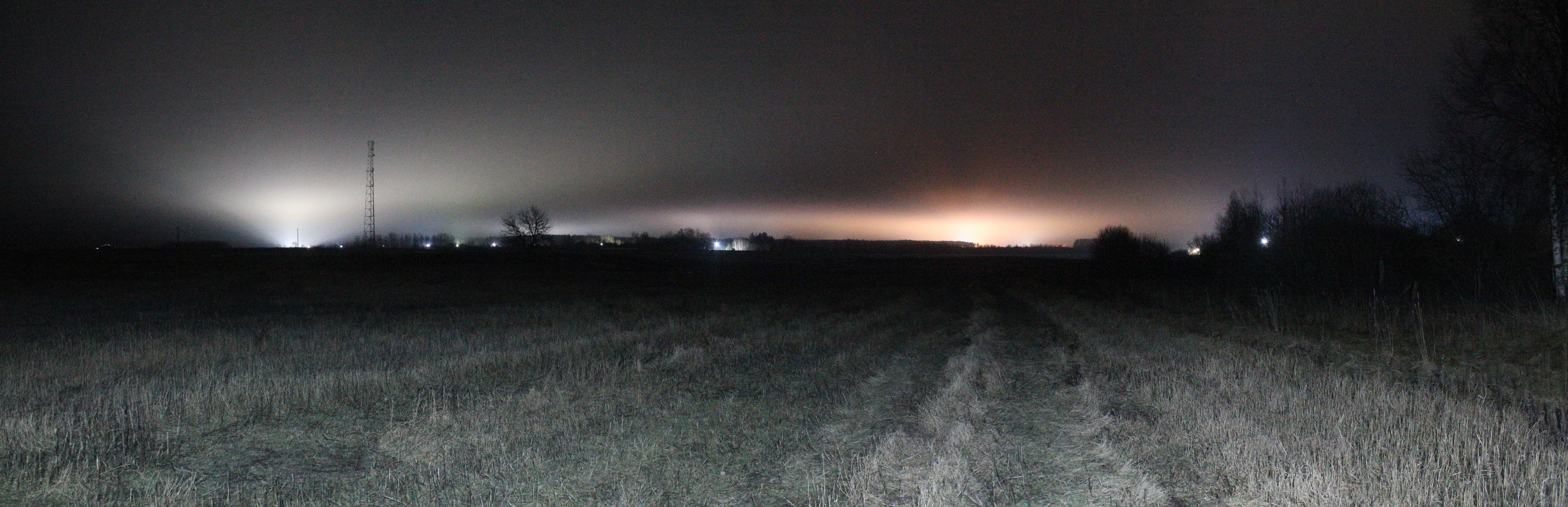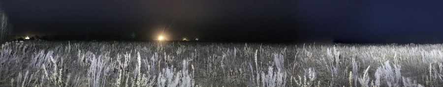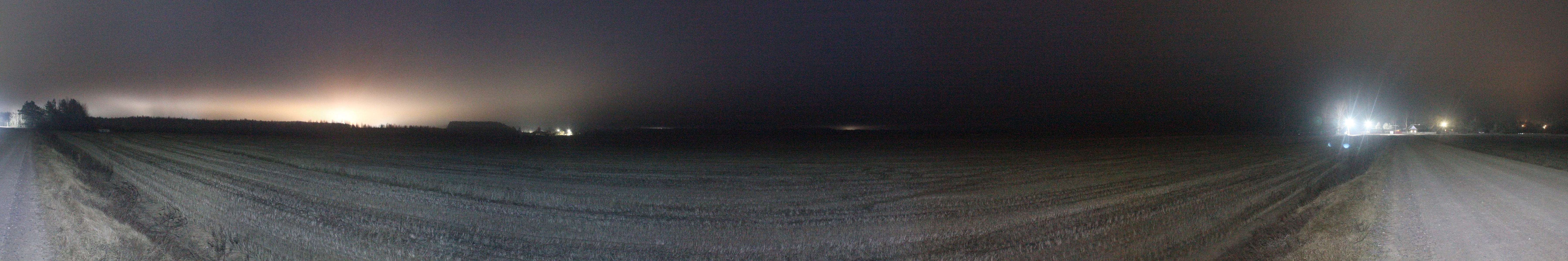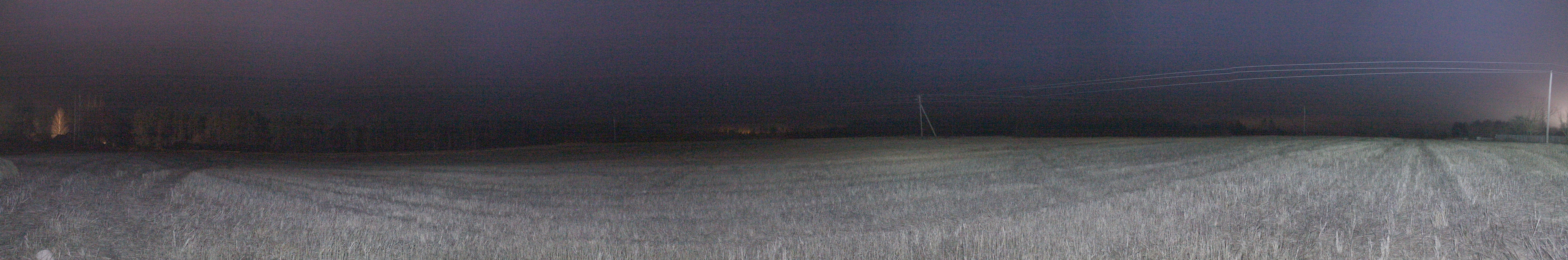 Постепенно влажность повышалась и свет от фонарика стал рассеваться сильнее. Истинный масштаб влияния дымки на рассеивание локальных источников засветки я увидел, обогнув деревню с севера и выйдя к западной границе поля на северо-востоке от деревни. Панорама ниже получена из кадров при ISO6400 и экспозиции 30 с. Панорама 90o поля северо-восточнее д. Перерожки, центр кадра на восток. Точка VH12.